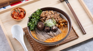 โซบะซุปเต้าหู้ผสมมิโซะโคชูจัง (Creamy Soy Milk Miso Gochujang Soba with Spicy Fried Pork)