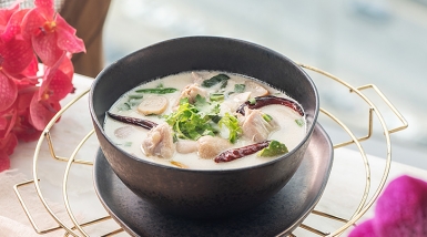 ต้มข่าไก่มารีกีมาร์ (Tom Kha Gai) สูตรโดย เชฟปิ๊ก-คณิน สินพันธ์ จากโรงแรมวินแดม แบงค็อก ควีน คอนเวนชั่น เซ็นเตอร์