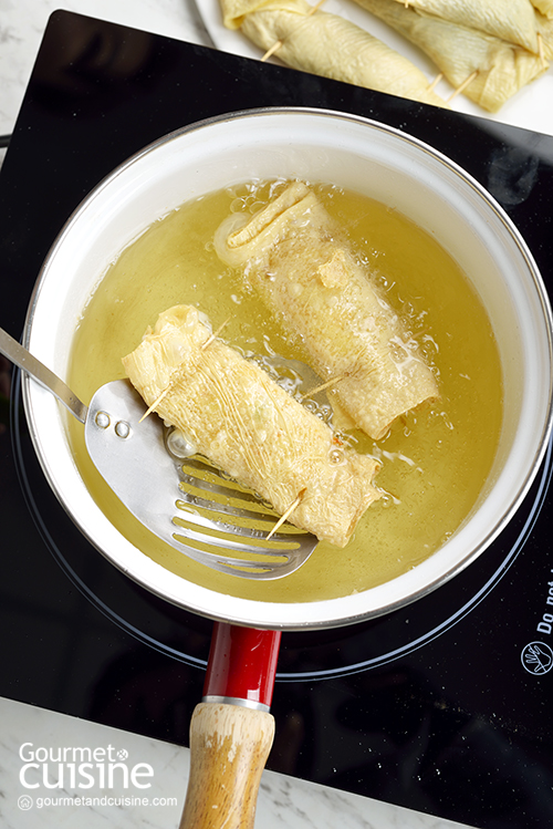 เมนูอาหารจีนทำง่าย ใช้เรียกน้ำย่อยได้ดีอย่าง “ฟองเต้าหู้ห่อกุ้งทอด” ติ่มซำของทอดจุดสำคัญอยู่ที่ไส้กุ้ง เนื้อกุ้งต้องหวานเหนียวหนึบอร่อย ฟองเต้าหู้ที่ห่อควรทอดให้กรอบและไม่อมน้ำมัน