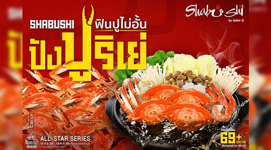 ชาบูชิ (Shabushi) สร้างปรากฎการณ์ความอร่อยสุดปังปูริเย่ เสิร์ฟรสชาติความสุข...ไม่สิ้นสุด ภายใต้แคมเปญ ALL-STAR SERIES ครั้งแรกของบุฟเฟต์ปู !!! ฟินปูเน้น ๆ ฟินปูไม่อั้น จัดเต็มพร้อมน้ำจิ้มสไปซี่ซีฟู้ดรสชาติจัดจ้าน แซ่บ...สะใจ โดยจ่ายเพิ่มเพียง 69 บาท+/คน