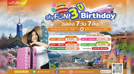 สกายฟันทราเวล ฉลองครบรอบ 3 ปี เปิดตัวแคมเปญ “Skyfun 3 ปี Birthday ฉลอง 7 วัน 7 คืน” มอบแพ็กเกจท่องเที่ยวสุดคุ้ม!