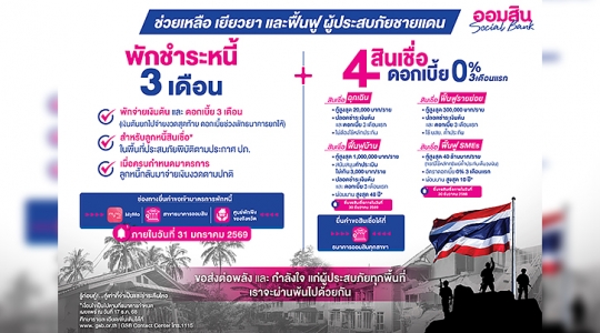 ออมสิน จัดเต็มชุดมาตรการช่วยลูกหนี้ในพื้นที่ชายแดน พักหนี้ 3 เดือน - ดอกเบี้ยยกให้ สินเชื่อพิเศษ ดอกเบี้ย 0% ใน 3 เดือนแรก