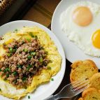 เป็นเมนูอาหารเช้าที่ทำครั้งเดียวได้ 2 เมนู มีหมูสับปรุงรส กินกับไข่แผ่นหรือไข่ดาวลวกที่ทำเหมือนไข่ลวกที่ไข่แดงยังเยิ้มๆ อยู่   ส่วนผสม (สำหรับ 2 ที่) ไข่ไก่(เบอร์ 3) 4 ฟอง หมูสับ 100 กรัม ต้น...