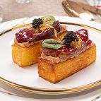 โทสต์ขนมปังสุดหรูเสิร์ฟกับตับเป็ดชิ้นใหญ่ ย่างให้ได้ระดับความสุกกำลังดี เนื้อในเป็นครีมคัสตาร์ด วางบนโทสต์ขนมปังบริออช กินคู่กับซอสราสป์เบอร์รีรสเปรี้ยวหวาน ท็อปด้วยคาเวียร์เข้ากันได้อย่างลงตัว   ส่วนผสม (สำหรับ 2 ท...