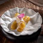 ขนมกล้วยยุคใหม่ในสูตรนี้คือไอศกรีมวานิลลาอบควันเทียนใส่ในช็อกโกแลตที่เป็นรูปกล้วยหอมสีเหลืองสดใส เพิ่มความกรุบกรอบด้วยตูเลงาขาว   ส่วนผสมไอศกรีมวานิลลาสโมก (สำหรับ 4-8 ที่) วิปปิงครีม  250 ...