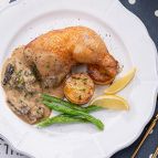 สะโพกไก่เบญจาเนื้อนุ่มหนังบาง แช่ในน้ำเกลือ นำไปโพช (Poached) ด้วยไฟอ่อนจนเนื้อนุ่ม แล้วทอดจนหนังกรอบเหลือง กินคู่กับซอสครีมเห็ดมอเรลกลิ่นหอมและมันฝรั่งฟองดอง   ส่วนผสม (สำหรับ 2 ที่) เนื้อสะโพกไก่ติดน่อง ตรา...