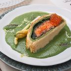 จานสุดหรูเวลลิงตันแซลมอน เนื้อชุ่มฉ่ำมีไส้เห็ดผัดสลับชั้นกับผักโขมผัด ให้รสชาติหวานและมัน ห่อด้วยแป้งพัฟทำเป็นรูปเกล็ดปลา กินคู่กับซอสครีมผักโขมและไวต์แอสพารากัส ตกแต่งด้วยไข่ปลาแซลมอนดูสวยงาม   ส่วนผสม (สำหรับ 3-4 ...